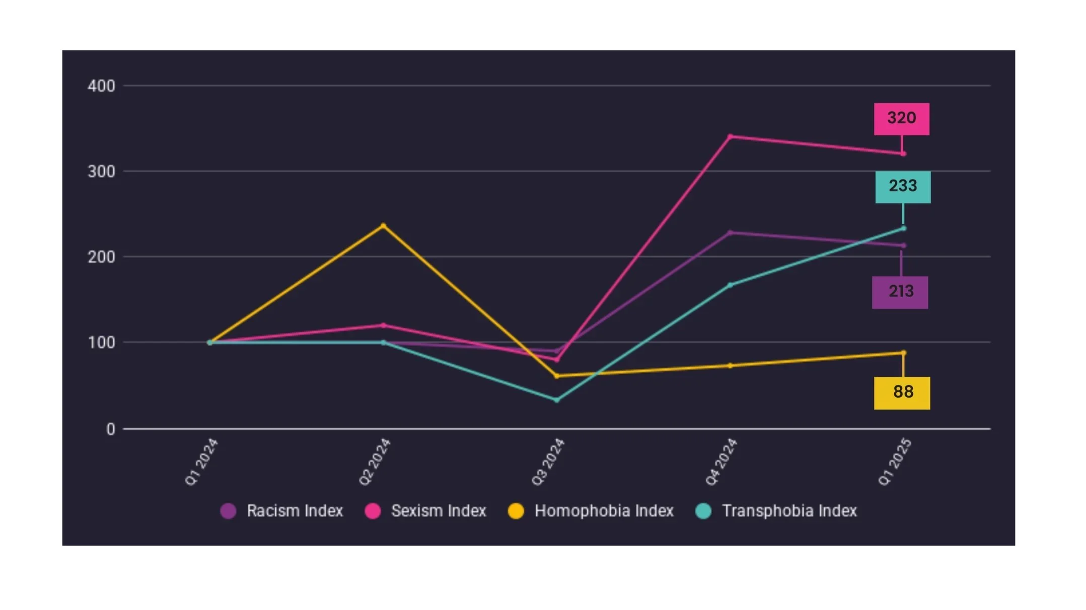Quarterly trends show these categories consistently leading in volatility and growth, with sexism hitting an index high of 340 and transphobia tripling over just two quarters.