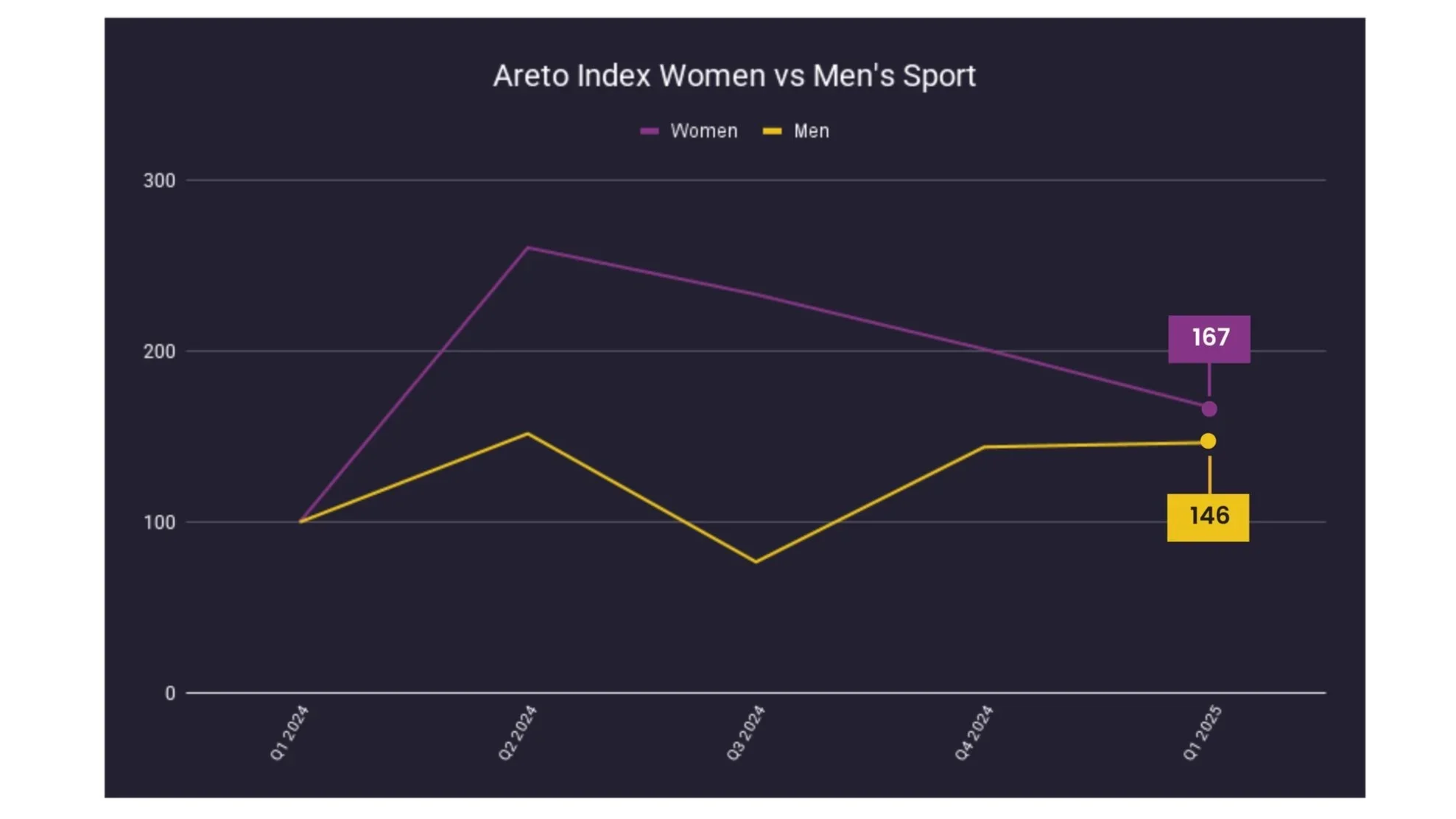 While online abuse is rising across the board, women’s sports consistently face higher levels of toxicity, ending Q1 2025 at 167 compared to 146 for men’s sports.