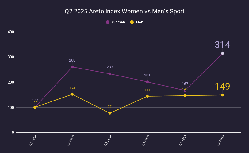 The Women’s Sports index hit 314 in Q2 (+88% QoQ and +21% YoY), marking a dramatic—and negative—rebound after three consecutive quarters of decline.