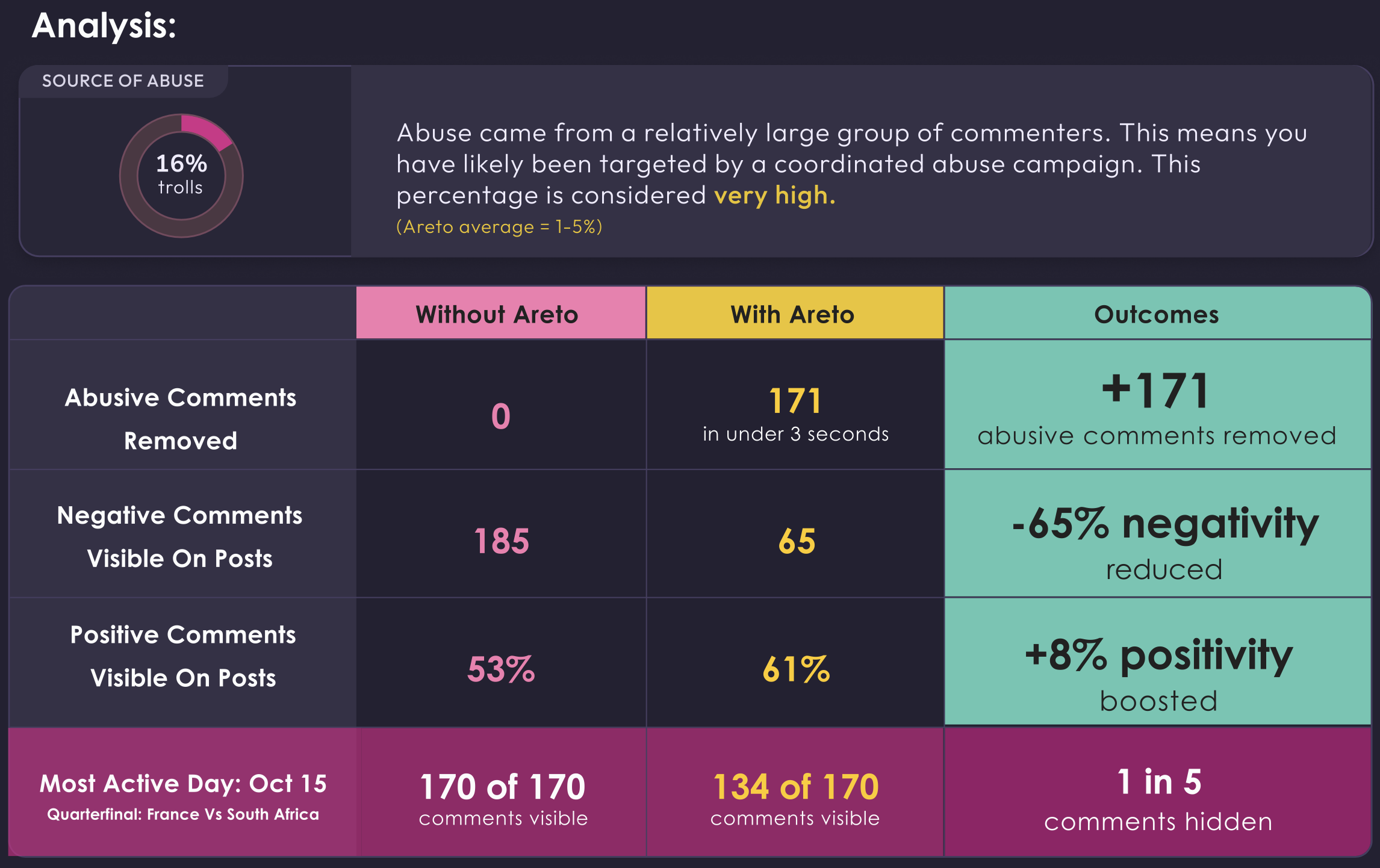 Ben's enthusiasm for social media interaction—part and parcel of the modern sports experience—was at risk due to the increasingly prevalent issue of online abuse. After enduring this unfortunate digital reality in the past, Ben anticipated the onslaught RWC 2023 would bring. Stepping in as defense for his online identity, Areto Labs partnered with Ben in early September, their mission defined: shield Ben's social media from toxic commentary in multiple languages, and ensure he could concentrate on his on-field decisions during RWC 2023 without the distracting noise of negative social media chatter.